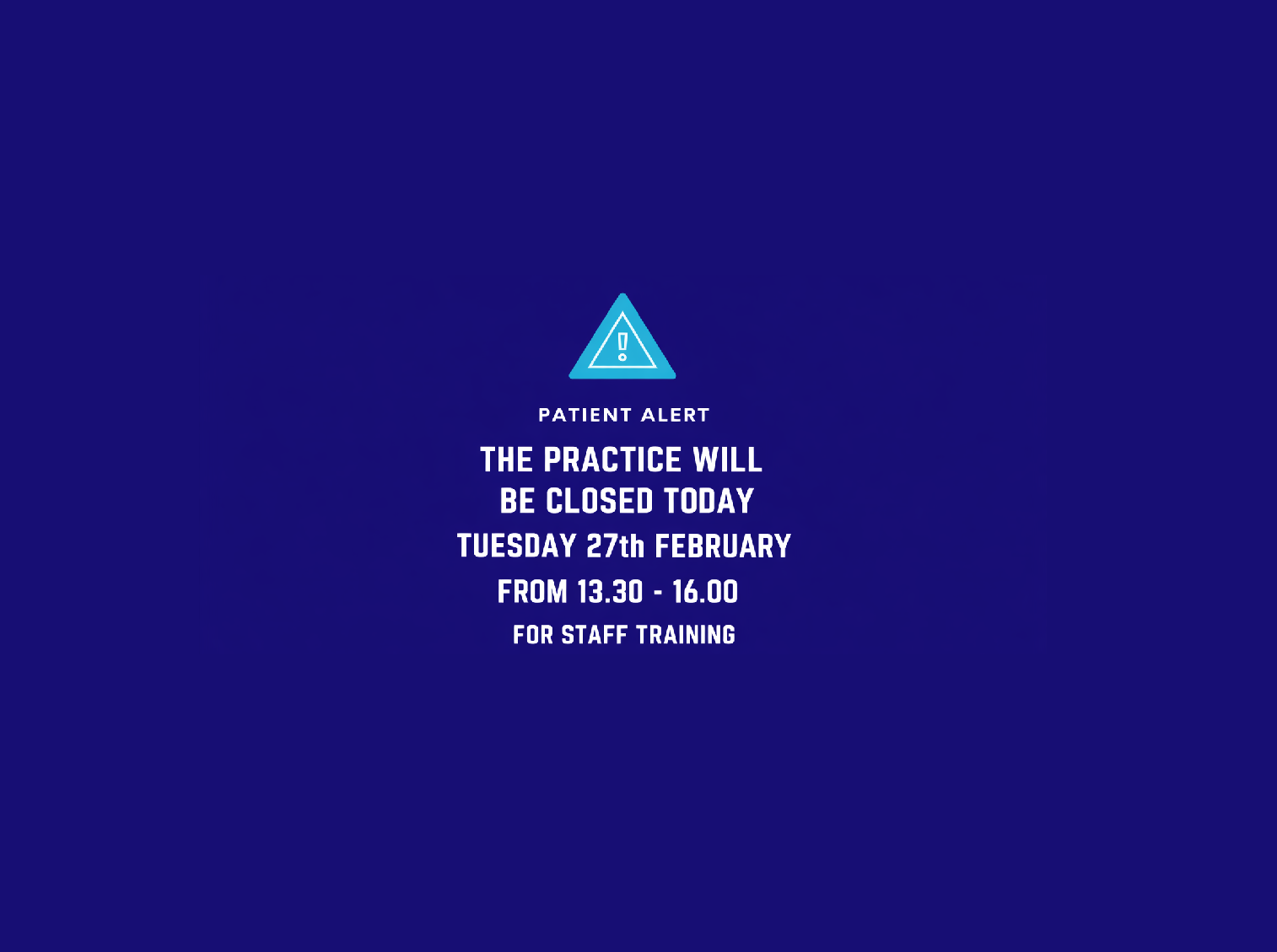 The practice will be closed today for staff training between 13.30 and 16.00. Phone lines will remain open for emergencies only.